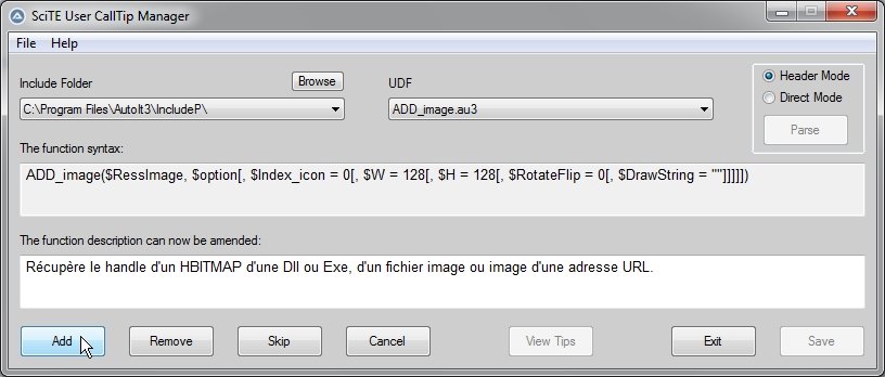 Pour les includes Pour les fonctions Vous retrouverez ces explications sur le forum us https://www.autoitscript.com/wiki/Addin ... _and_SciTE