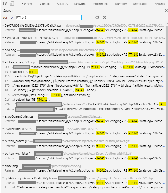 A ce stade, tu as toutes les armes. Imagine que tu fasses ta recherche sur la page search.php (c'est un exemple). Dans l'onglet "Network", tu verras, par exemple encore, "search_ajax.php?s=MS-0A17355" s'il s'agit d'un AJAX via GET, sinon, tu verras tes paramètres dans Network > Cliquer sur la trame > Headers > Tout en bas dans "Query String Parameters".