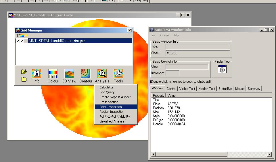 - en plan intermédiaire, en grisé: la fenêtre Window Info qui ne trouve aucun titre, aucune Class, aucune instance spécifique au bouton "Analysis" ni à l'item "Point Inspection". Il détecte bien la fenêtre Grid Manager, la TtoolBar contenant les logos (instance 1) mais dès que je clique sur l'un d'eux et que je sélectionne un item, Window info "perd" le nom de la fenêtre, etc. (voir jpg)