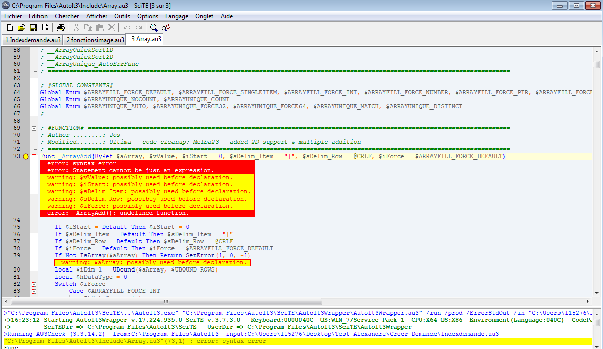 Voilà, donc j'ai enlevé le script qui m'a posé ce soucis, j'ai enlevé l'include Array.au3, j'ai fouillé dans toutes les parties du script, et il n'y a plus une trace de redirection vers Array. J'ai recréé mon script sur un nouveau fichier, j'ai tout fouillé, et la seule redirection que j'ai, c'est mon fichier Excel.au3 qui renvoi vers Array.au3. Le truc c'est qu'avant de tester ce code, tout fonctionnait très bien et la seule mise en place de ce code m'a tout fait sauter et désormais je ne peux plus rien faire. Je suis allé chercher mon Array.au3 sur un autre ordinateur sur lequel ça fonctionne, mais dès lors que je l'ai mis sur celui-ci, ça ne marche toujours pas. Je ne comprends pas, alors j'espère que vous aurez des solutions à me proposer