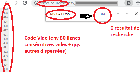 En gros, tu n'as pas de fiche produit dès le début. Tu as un résultat de recherche qui te renvois ensuite, si tu clic, sur une page produit. Idem pour cette page produit, quand tu clic, tu n'as aucune info "YXZ" dans le code source. Par contre, tu as une grande zone "blanche" (ce que j'appelle "partie cachée" = saut de lignes multiples) dedans. En fait, je pense que tu as la place pour le code source qui est caché.