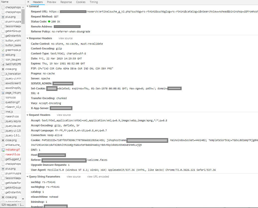 A ce stade, tu as toutes les armes. Imagine que tu fasses ta recherche sur la page search.php (c'est un exemple). Dans l'onglet "Network", tu verras, par exemple encore, "search_ajax.php?s=MS-0A17355" s'il s'agit d'un AJAX via GET, sinon, tu verras tes paramètres dans Network > Cliquer sur la trame > Headers > Tout en bas dans "Query String Parameters".