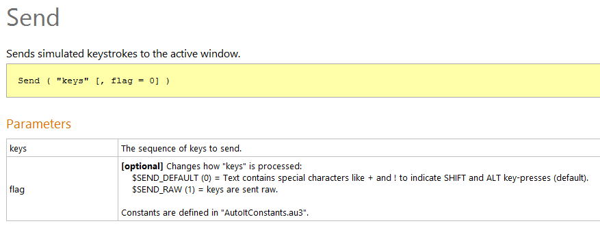 Tiré de la documentation de la fonction Send() de l'aide de AutoIt :