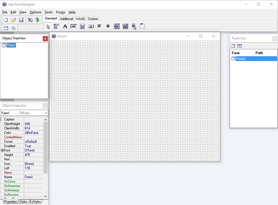 • Dans la partie supérieur de la fenêtre vous avez les onglets Standard, Additional, Win32 et Custom, vous trouverez les différents objets disponibles pour la création de votre fenêtre.