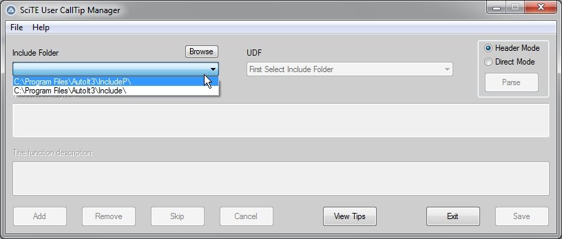 C:\Program Files\AutoIt3\IncludePDe Scite, ouvrir Scite Config Ouvrir la "dialogbox" et sélectionner le dossier clic sur save+apply.