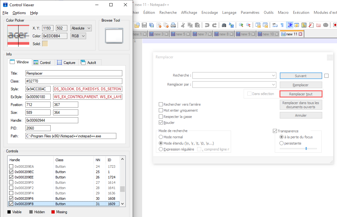 Mon souci se situe sur NP++. Quand je lance un Ctrl Shift R, j'ai bien la bonne fenêtre de recherche. J'arrive à renseigner les champs Recherche, Remplacer par, Filtres, Dossier mais ensuite, je n'arrive pas à me positionner sur le bouton Remplacer tout. Autoit Window Info ne le voit pas et si je l'attaque avec :
