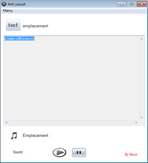 je le regret de vous dire qu'en Europe (et peut être mondial qui sais) , nous faisons partit des plus nul en Anglais (généralement). Chanter en yaourt est une technique qui consiste à chanter en produisant des sons, des onomatopées, des syllabes qui font penser qu'il s'agit d'une langue réelle. Voila qu'intervient mon script ! il permet dans une salle fenêtre de mettre ses paroles (fichier texte) et sa musique (en mp3). vous cliquez sur la flèche, et c'est parti ! la musique commence. vous pouvez aussi la mettre en pause. j'ai intégré une gui avec internet pour aller chercher son fichier txt.